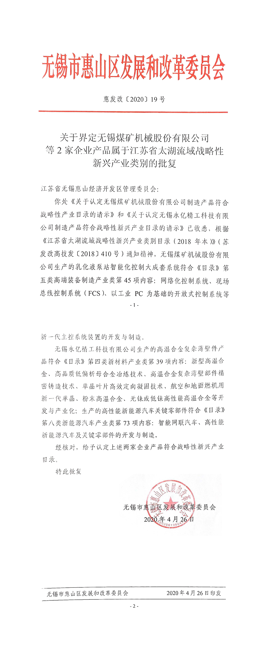熱烈祝賀無錫煤機生產(chǎn)的乳化液泵站智能化控制大成套系統(tǒng)申報“江蘇省太湖流域戰(zhàn)略性新興產(chǎn)業(yè)類別”成功,并獲批文。特此祝賀!